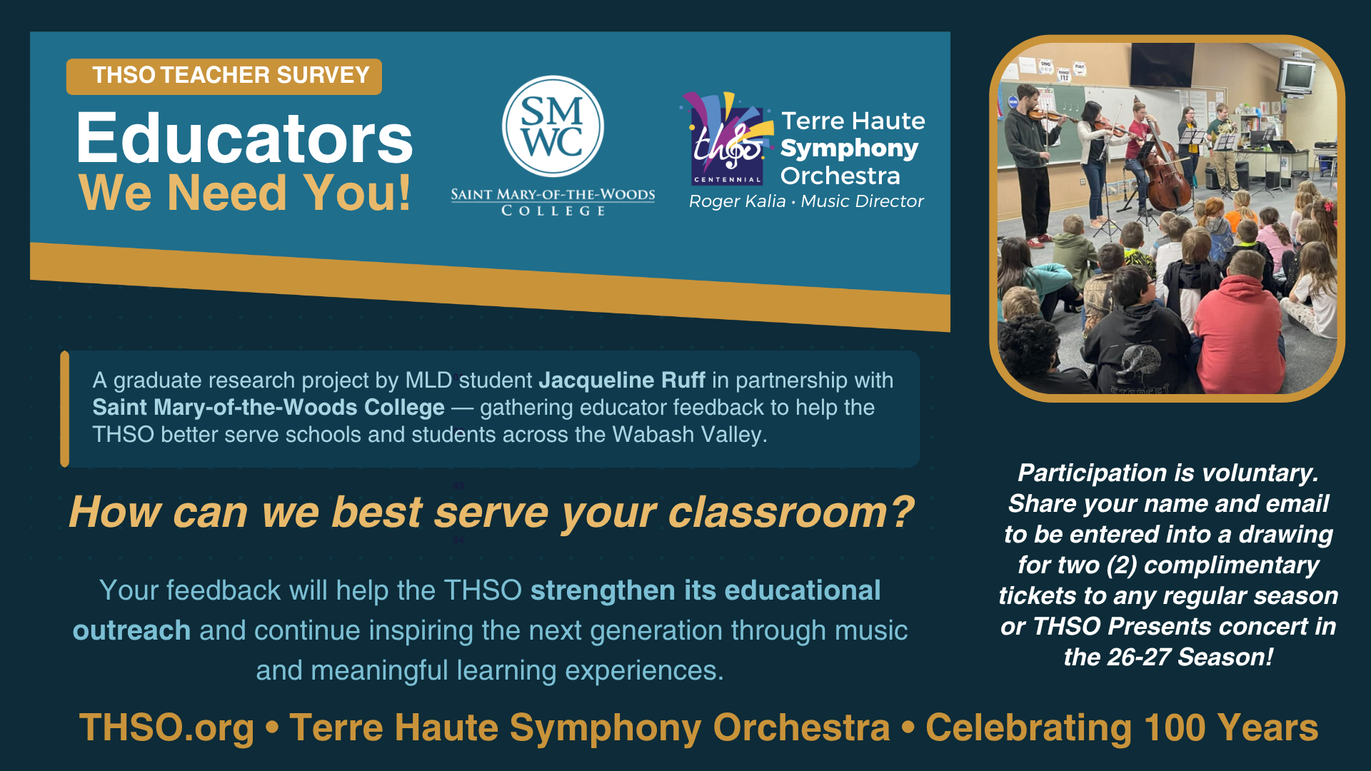 SAVE THE DATE! The THSO is excited to host a special Centennial Gala on September 10, 2026 at O’Shaughnessy Hall at Saint Mary-of-the-Woods to celebrate the Symphony’s 100th Anniversary as the oldest professional symphony in Indiana! Join us for a delectable meal and special concert featuring the Terre Haute Symphony Orchestra conducted by Music Director Roger Kalia and Principal Guest Conductor & Conductor Laureate David Bowden!