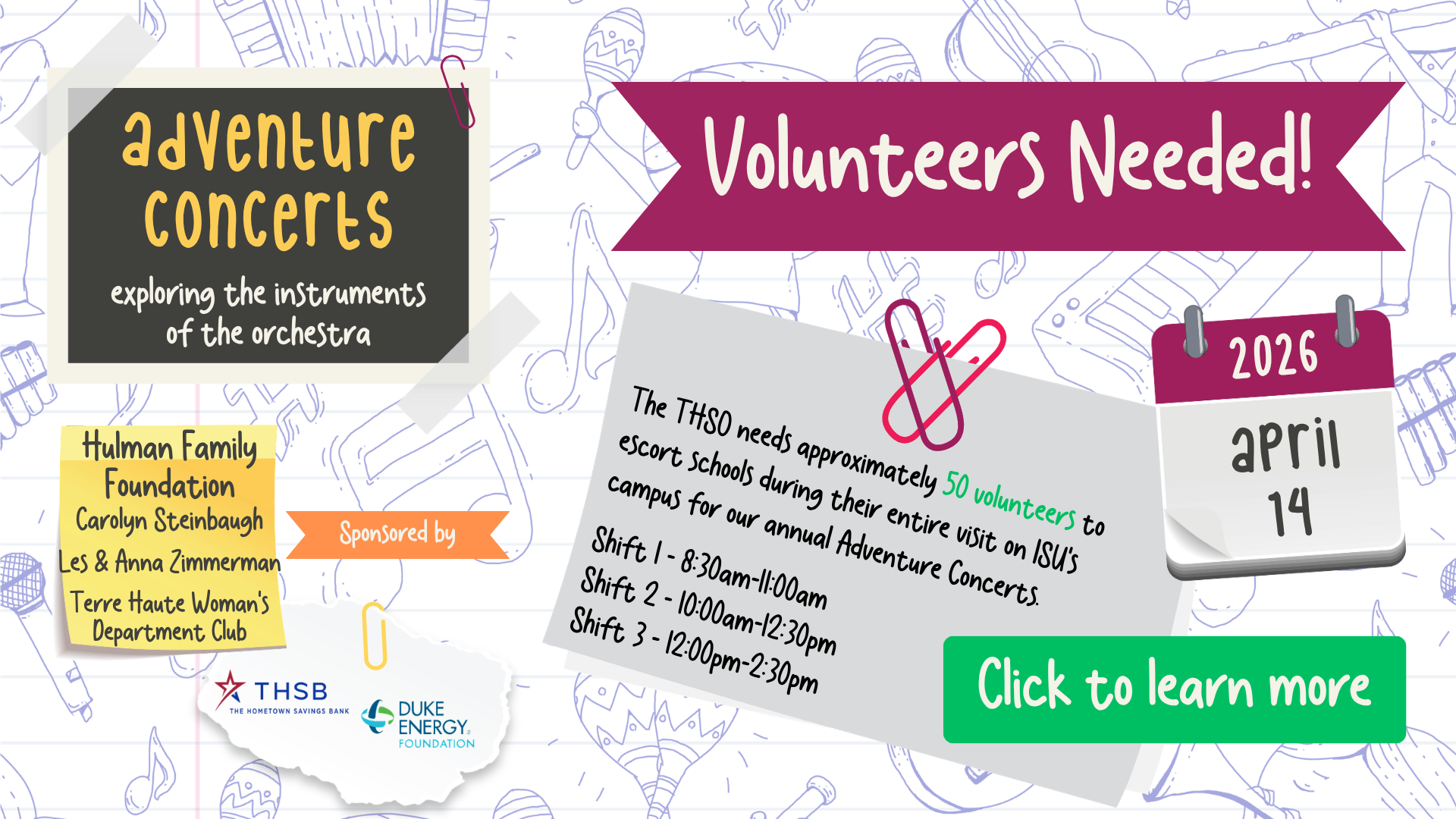 Adventure Previews - 5-6 THSO Musicians travel to each elementary school in Vigo County and share a 25-minute presentation that features excerpts from Star Wars and the William Tell Overture as well as instrument demonstrations. The goal of the Previews is to get students excited for their big field trip to see the full orchestra in Tilson Auditorium and give them an opportunity to see the instruments up-close. Adventure Previews are currently only available for VCSC elementary schools.