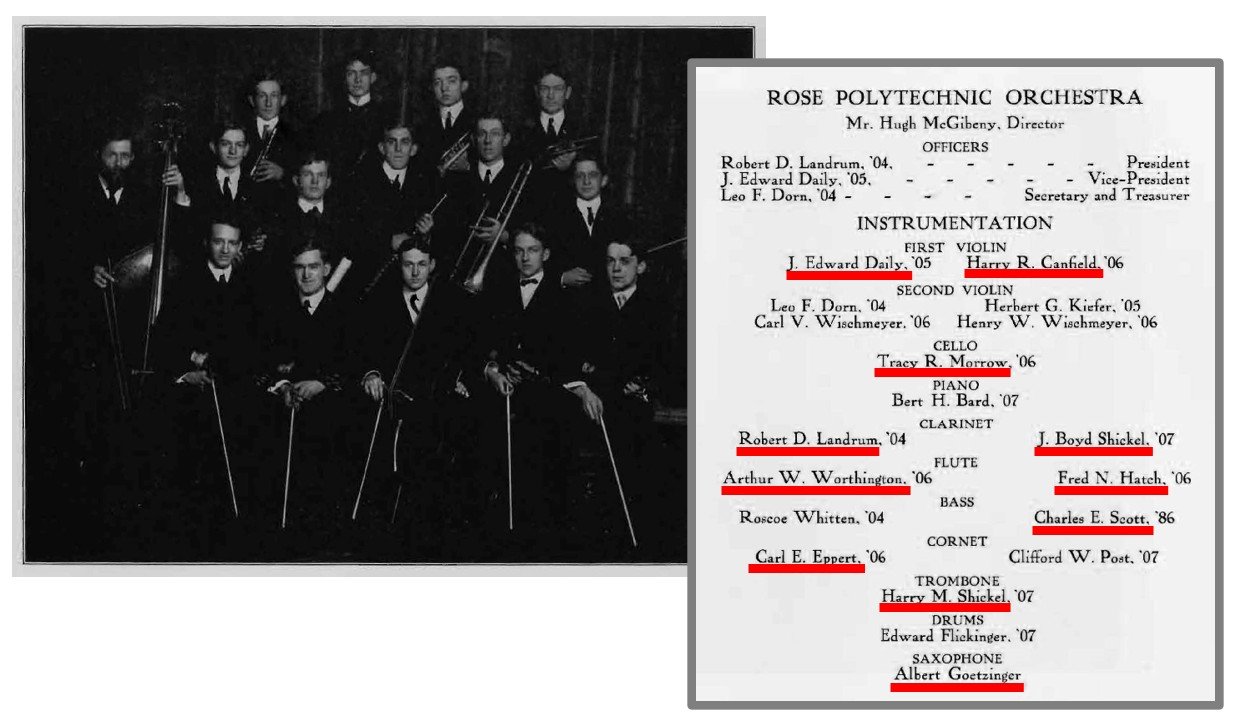 There are no known photos of Eppert’s Terre Haute Symphony Orchestra. However, eleven out of 19 musicians in the 1904/1905 Rose Polytechnic Orchestra, including Carl Eppert himself, were also members of the 1903-1907 THSO. Their names are marked in red above. Photo of the Rose Polytechnic Orchestra and list of names come from the 1905 Rose Poly Modulus yearbook.