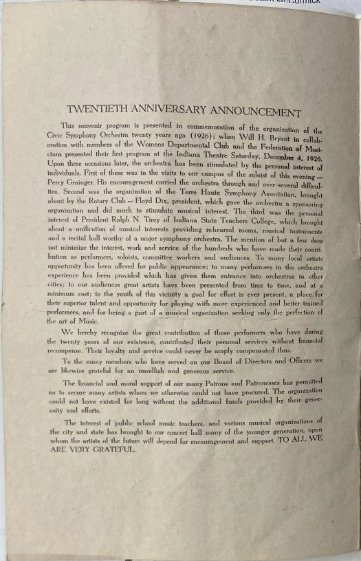 Program note for the 20th Anniversary Concert, March 26, 1946, from the THSO archive at the Vigo County Public Library.