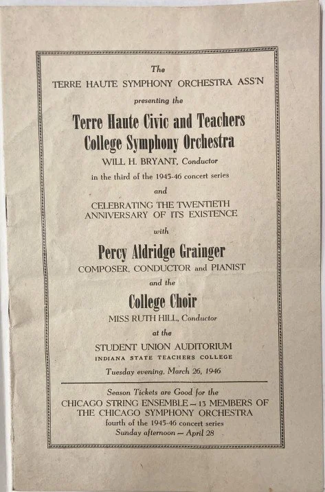 The THSO — or, rather, the THCTCSO — celebrated its 20th anniversary in 1946, having overcome the extraordinary challenges of both the Great Depression and the Second World War (stay tuned for a WWII post coming soon!). Percy Grainger returned for a celebratory concert in March 1946 on the anniversary of the orchestra’s first rehearsals. On that occasion, conductor Will Bryant wrote a special program note acknowledging those who were most responsible for the orchestra’s survival and success over the previous two decades. He credited the president of the local Rotary club for having overseen the formation of the Terre Haute Symphony Association. He thanked President Tirey for making the resources of the college available to the orchestra and providing it a performing home. But he began by acknowledging special guest Percy Grainger for his visits in the early Thirties, noting that “his encouragement carried the orchestra through and over several difficulties.” This indicates, once again, that his orchestra of the early Thirties had been the Terre Haute Civic and Teachers College Symphony Orchestra in all but name.