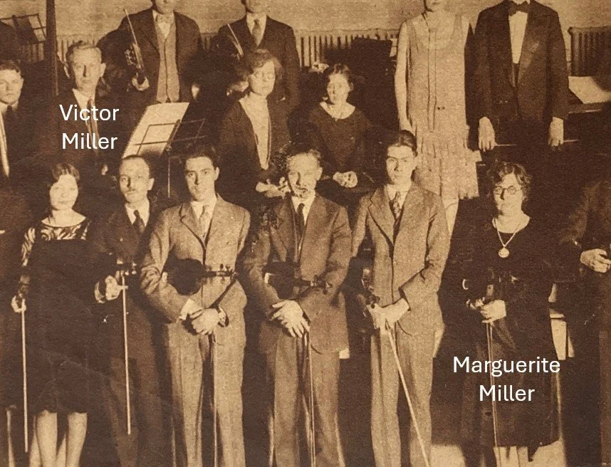 Marguerite and Victor both continued to play in the THSO for the next eight years, through the quiet years of the Depression and into the renewal season of 1934. Willfred Fidlar (standing next to Marguerite in the 1929 photo above) succeeded her as concertmaster and she became Assistant Concertmaster. That season would be her last in the THSO, after having performed for the orchestra and its forerunners for nearly thirty years.