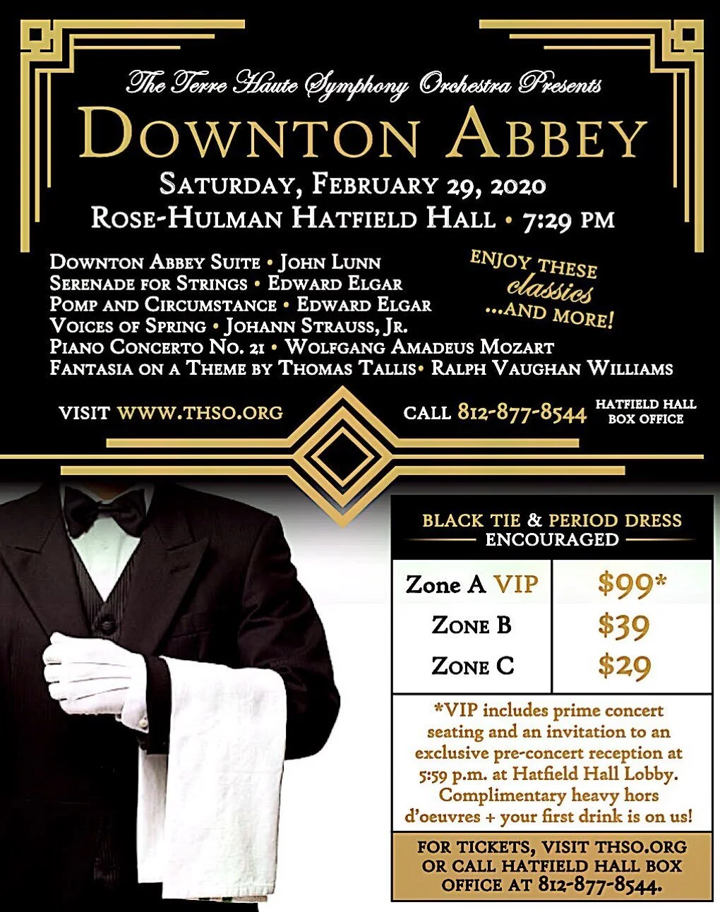 Hear beautiful music from John Lunn (composer of the Downton Abbey theme), Vaughan Williams, Holst and Elgar, along with Mozart and J. Strauss Jr., in the gorgeous acoustics of Hatfield Hall. This "Leap Year" black-tie (optional) fundraising concert will be performed by members of the THSO on 2/29 @ 7:29pm for $29 to $99.