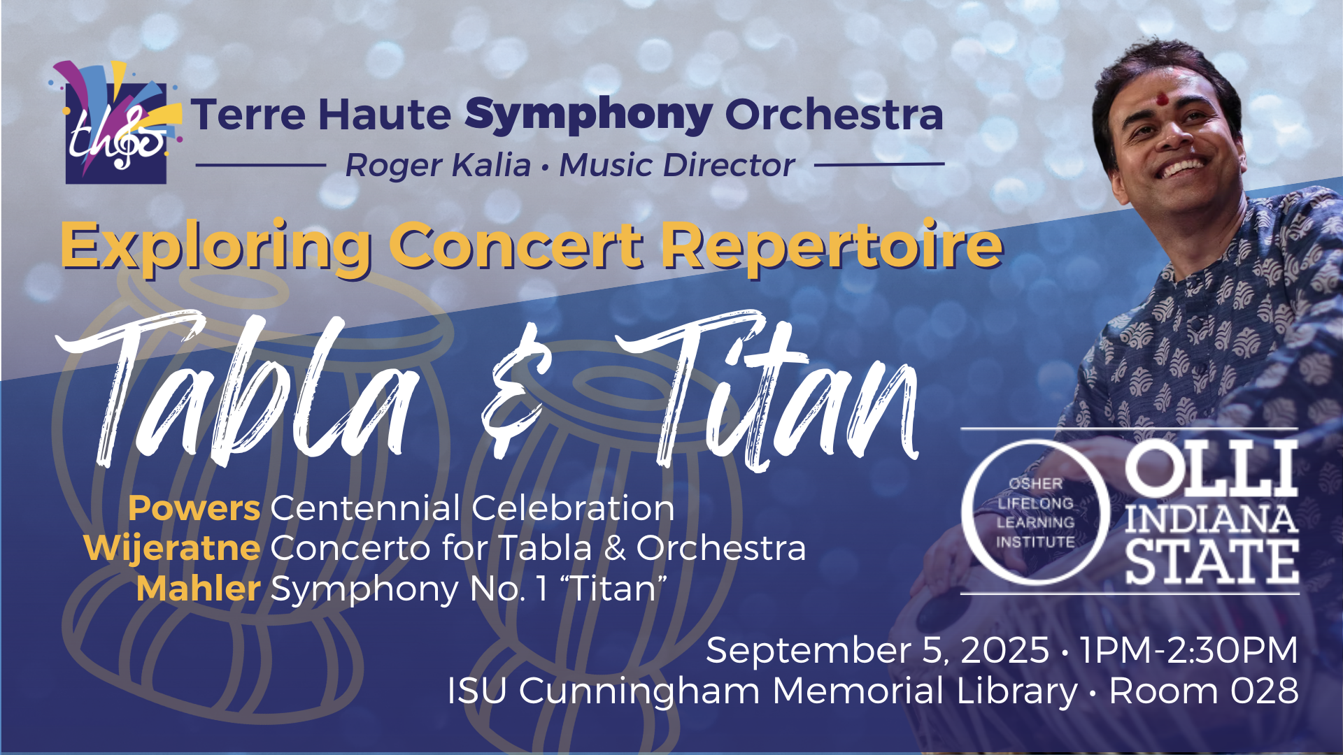 Join members of the Terre Haute Symphony Orchestra, as they preview the THSO’s opening concert of the 2025-2026 season, Tabla & Titan, on September 13, 2025. The concert features Indian tabla master Sandeep Das in a captivating concerto, followed by the grandeur of Mahler's Symphony No. 1 “Titan.” The concert will seamlessly blend Indian classical rhythms with Western symphonic brilliance, offering a unique and enriching musical journey. Plus, a special commission from Composer-in-Residence Dan Powers and the introduction of our new Music Director, Roger Kalia! Don't miss this extraordinary fusion of cultures and sounds!