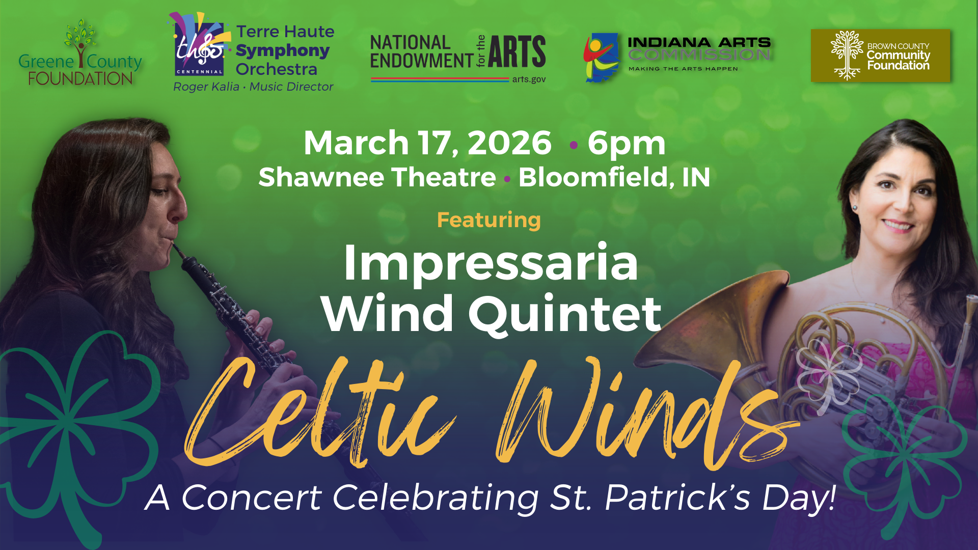 The Impressaria Wind Quintet is coming to Bloomfield, IN! Join us on Tuesday, March 17 at 6pm at the Shawnee Theatre for a festive recital celebrating St. Patrick’s Day! This concert is FREE and open to the public! The quintet will also visit Bloomfield Elementary and White River Valley Elementary to share educational programs with students.