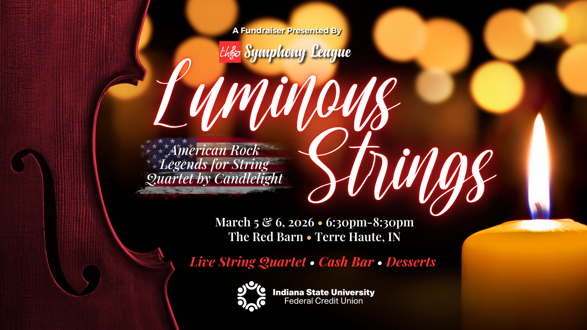 The Terre Haute Symphony League is excited to bring back Luminous Strings for TWO shows on Thursday, March 5, 2026 and Friday, March 6, 2026 at The Red Barn in Terre Haute, IN! Experience a live string quartet performing arrangements of your favorite American rock and pop bands surrounded by candlelight. Plus, enjoy a cash bar featuring signature cocktails, light desserts, and appetizers. Doors open at 6:30pm. Concert begins at 7:30pm.
