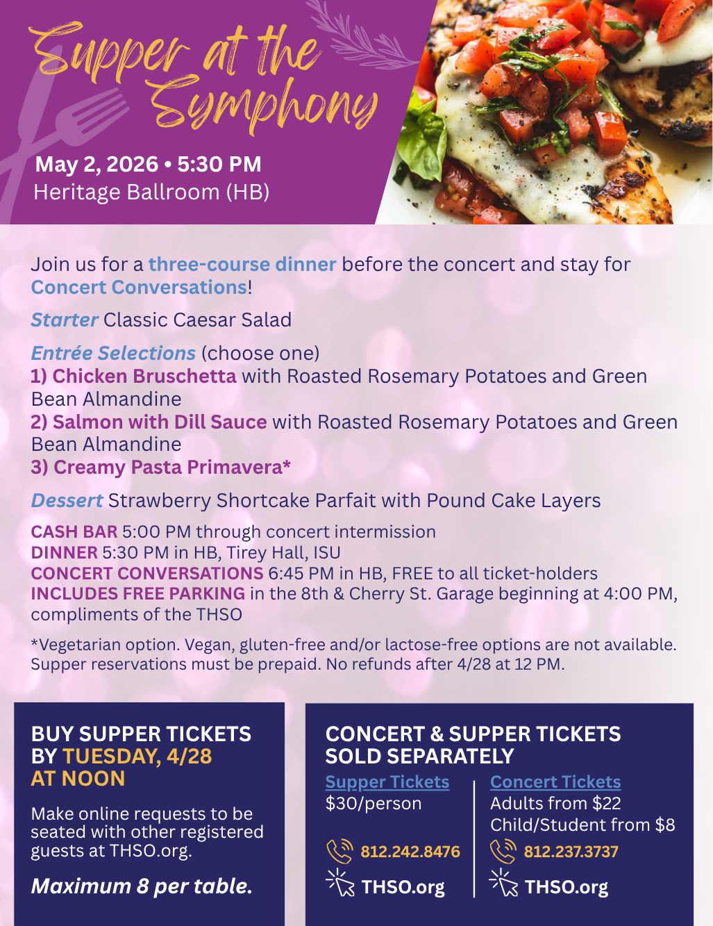 Dinner reservations for each concert open approximately 2-3 weeks prior to the concert. Please make sure you are signed up for our email list to get the latest updates about the THSO, including when dinner reservations open.