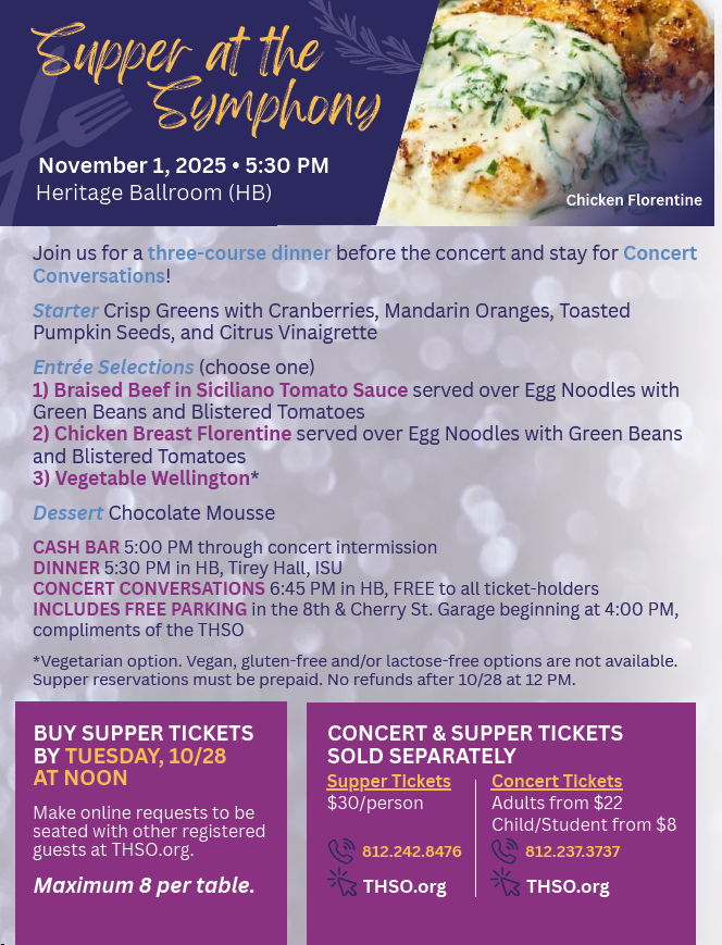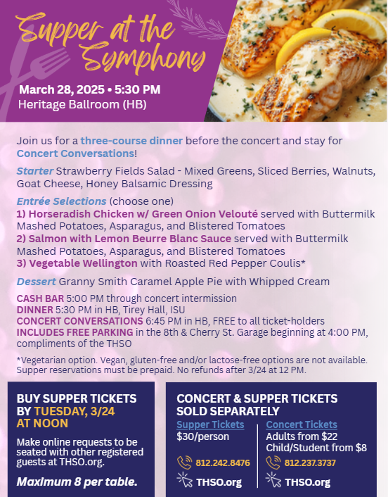 Come to a regular season concert early and enjoy a delectable three-course meal! Supper at the Symphony is served in the Heritage Ballroom of Tirey Hall, right down the hall from Tilson Auditorium. The cash bar opens at 5:00pm, and dinner is served promptly at 5:30pm. Supper tickets are $30/person.